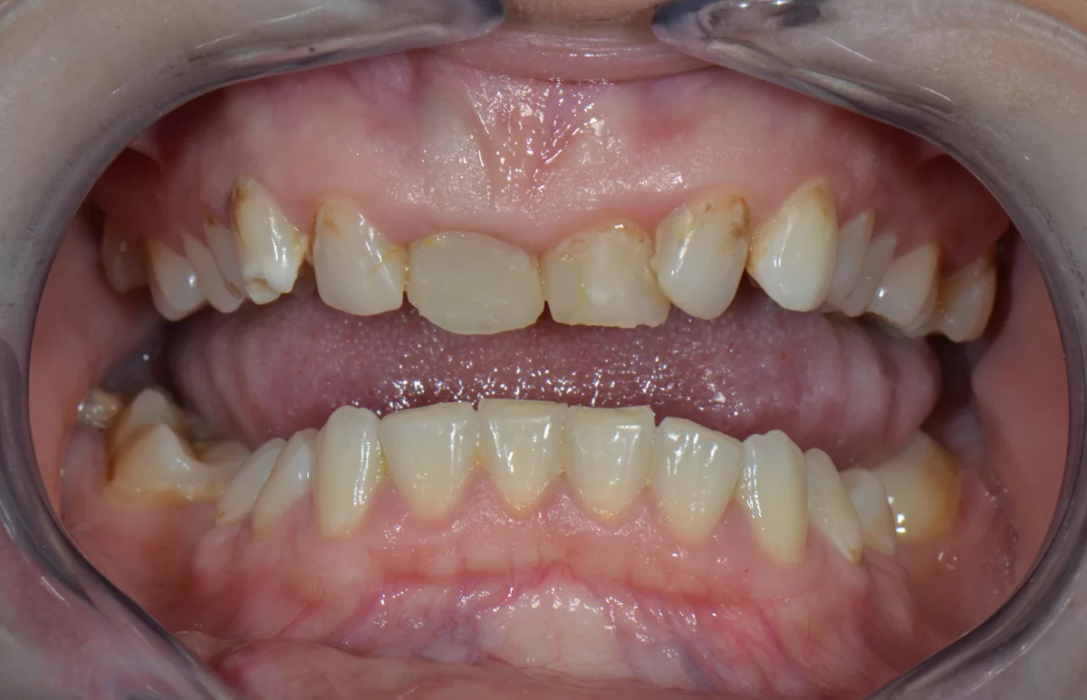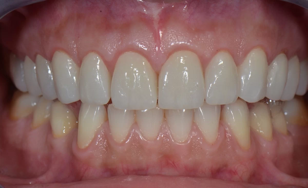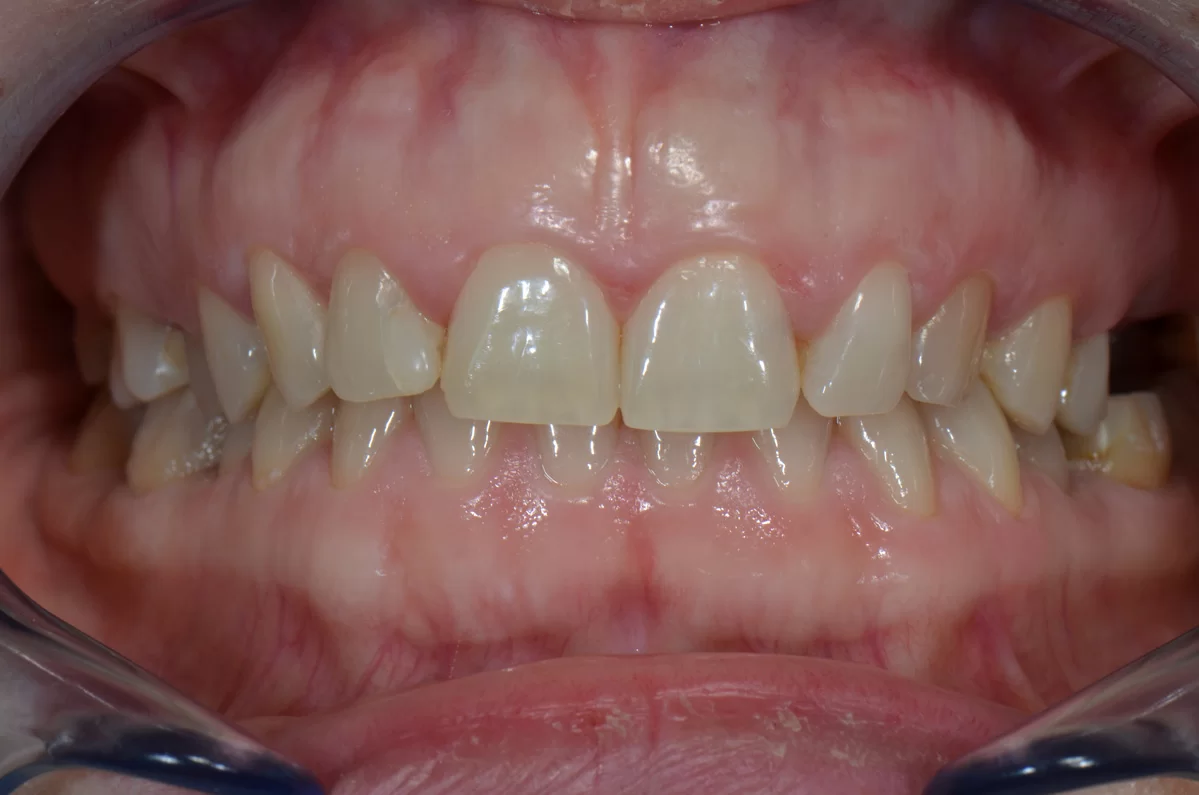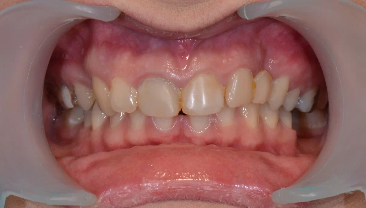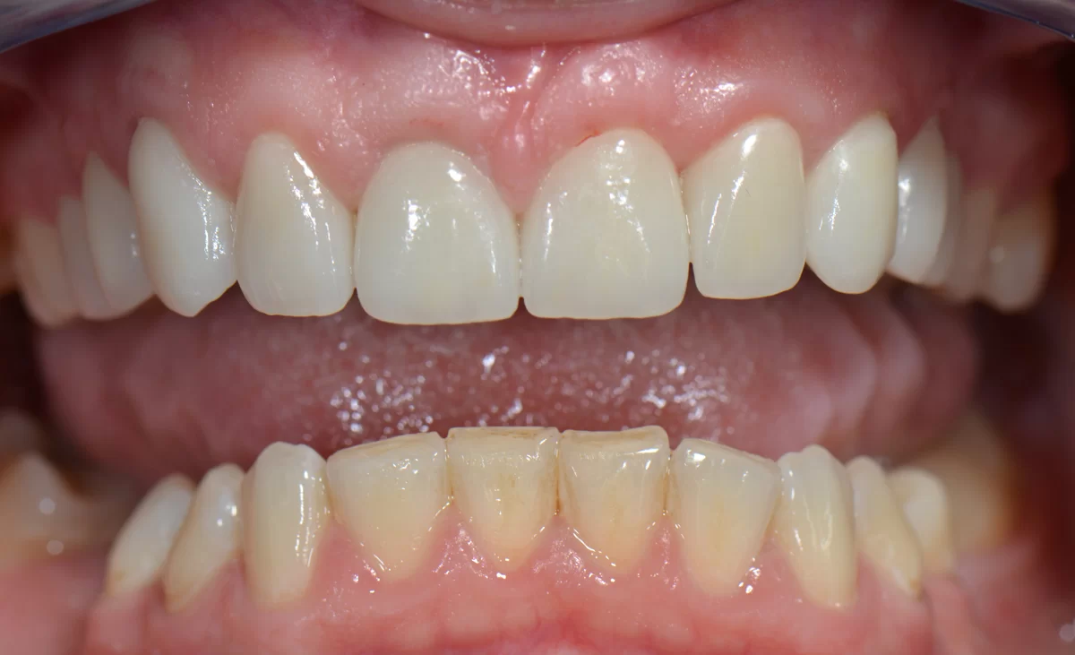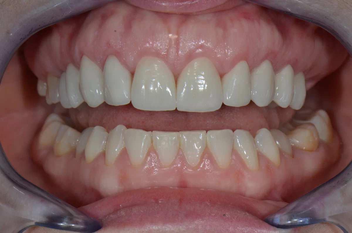 W tym przypadku pomimo wybielania pacjentka nie mogła uzyskać upragnionego koloru szkliwa. Wykonaliśmy u niej licówki. Jednak oprócz tego, u pacjentki występował wydatny uśmiech dziąsłowy ze względu na nadreaktywna dźwigacz wargi górnej. W toku terapii m. in. modelowaliśmy kość. Został także zastosowany botoks, aby uniemożliwić wardze wywijanie się.