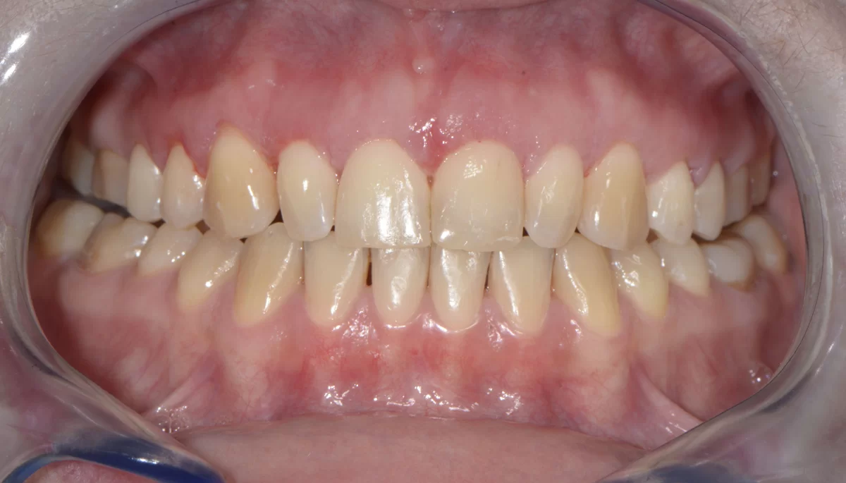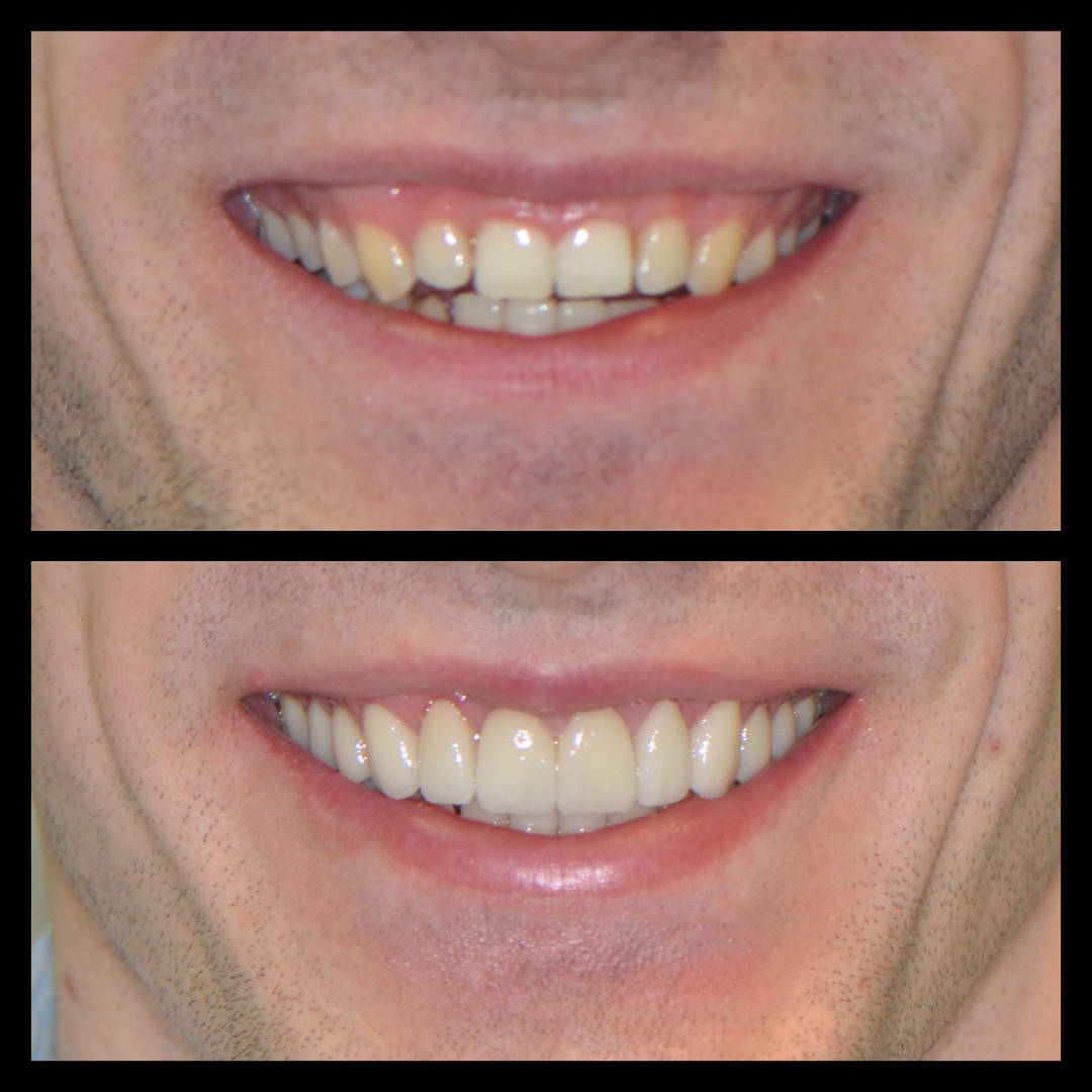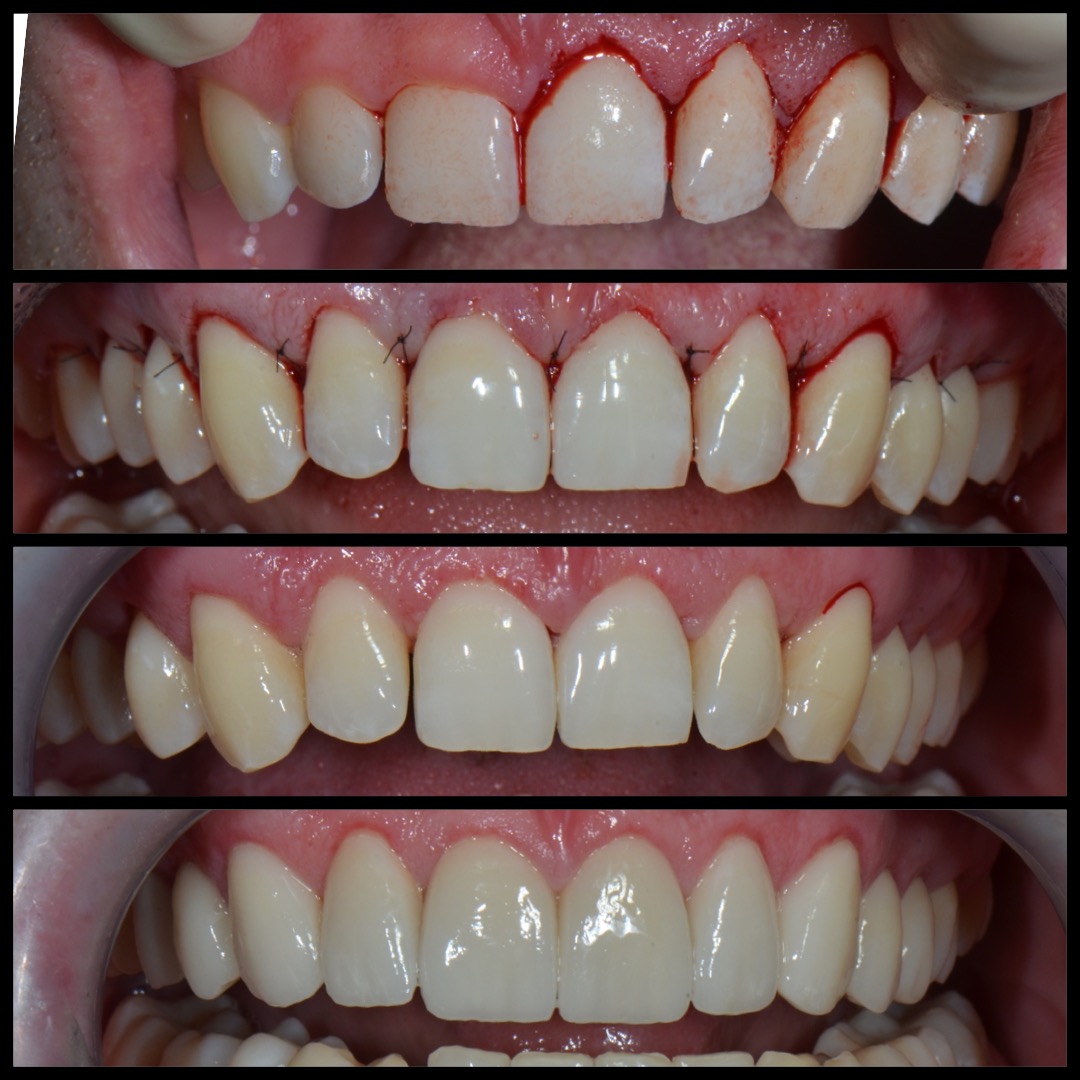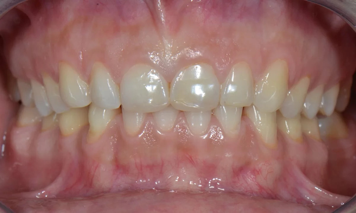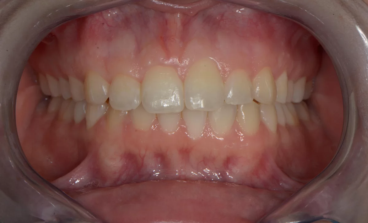 W tym przypadku pomimo wybielania pacjentka nie mogła uzyskać upragnionego koloru szkliwa. Wykonaliśmy u niej licówki. Jednak oprócz tego, u pacjentki występował wydatny uśmiech dziąsłowy ze względu na nadreaktywna dźwigacz wargi górnej. W toku terapii m. in. modelowaliśmy kość. Został także zastosowany botoks, aby uniemożliwić wardze wywijanie się.