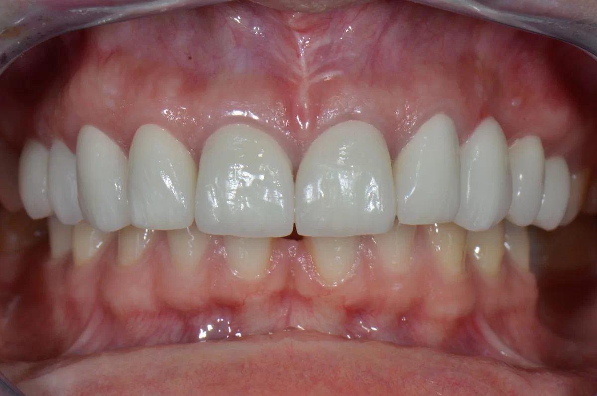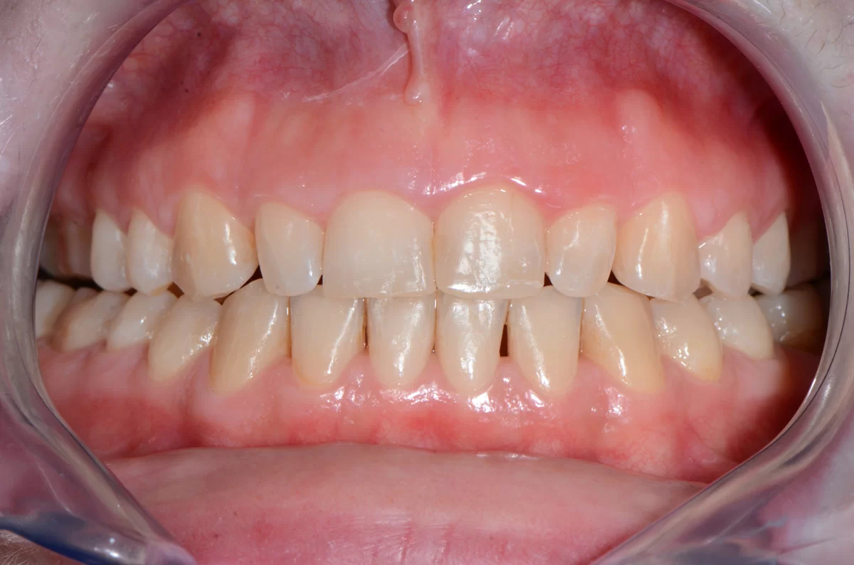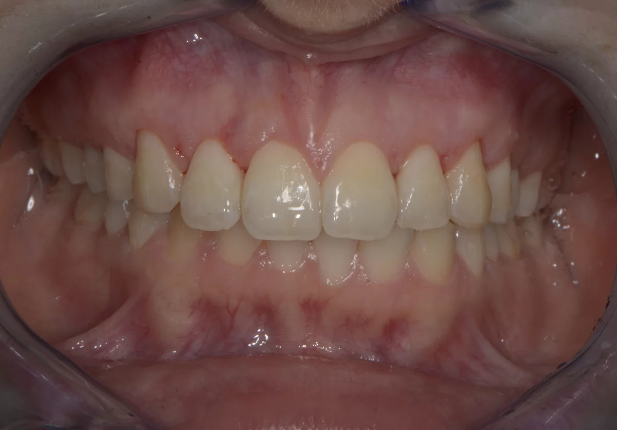 Pacjentka cierpiała z powodu nadmiaru dziąseł. W toku leczenia gummy smile usunęliśmy tę przypadłość, jak również podcięliśmy wędzidełko. Ponadto w toku leczenia protetycznego u pacjentki wykonaliśmy korony.